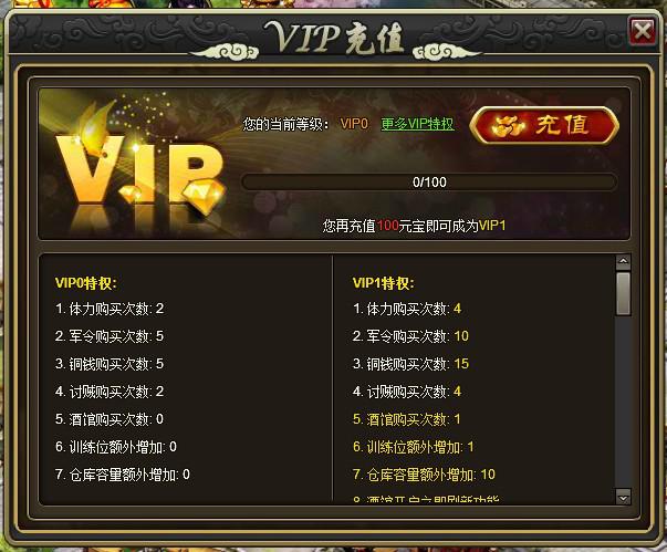 | 2 | 您现在是VIP2玩家 | 1.购买军令体力铜钱次数+1 2.购买讨贼次数+2 3.购买将领训练位+1 4.聚宝盆使用次数15 5.仓库容量+5 6.讨贼开启立即刷新功能 7.官爵开启高级提升功能 8.联盟城池冲锋陷阵冷却时间为90分钟 |