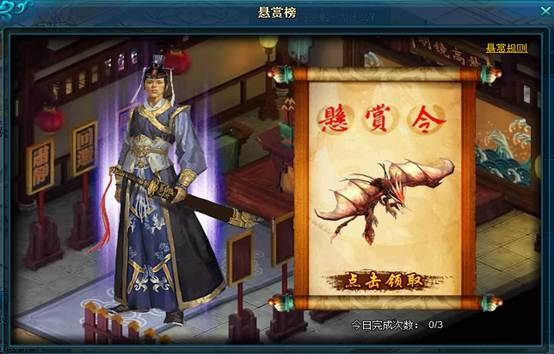 玩家可在主界面右侧的日常活动面板可接人物处接取悬赏任务,每天可接取悬赏任务3次,可使用不同等级的悬赏令,提升悬赏任务获得的奖励。