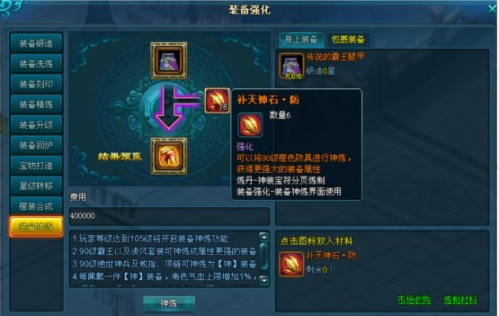 玩家等级达到105级时,【装备强化】界面将开放出【装备神炼】功能。