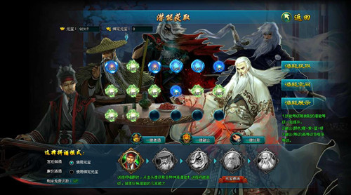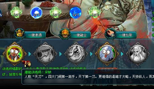 天下武学,激发潜能,才能达到极致。游戏中,潜能系统可以提升人物的附加属性或是获得逆天技能。打开潜能界面,玩家会进入一个酒宴页面,在酒桌边上,坐着5位当今武林的高人前辈,玩家要做的就是和他们喝酒。把高人灌醉后,就能获取潜能道具了。