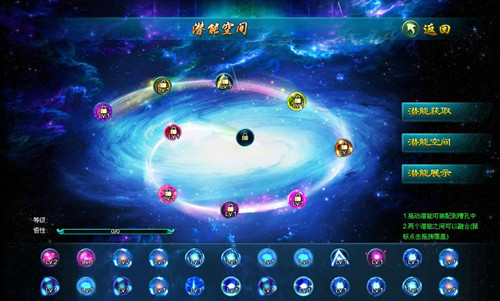 武学奥秘,犹如浩瀚宇宙。游戏中,潜能空间界面就以星空为背景,壮阔非凡。玩家一共有10个潜能槽,玩家可以将获得的潜能道具选择性的镶嵌其中。在选择镶嵌的潜能道具上,自由度很高,玩家可以依据自身需要,打造出独一无二的角色。