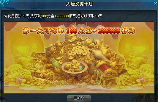 开服前3天在限购商城购买【大唐投资计划】,双击使用后可马上激活【大唐投资计划】系统,