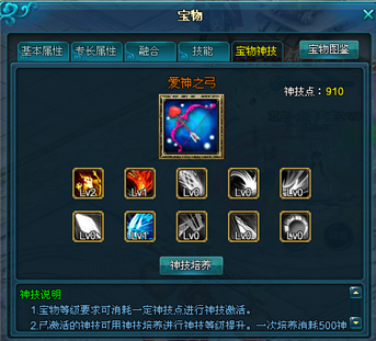 神技激活:玩家宝物等级到达一定等级、并且拥有足够的神技点(神技点可在神技试炼副本获得)时,可相继的激活宝物所有天赋神技,神技激活后可获得神技对应的被动效果加成。