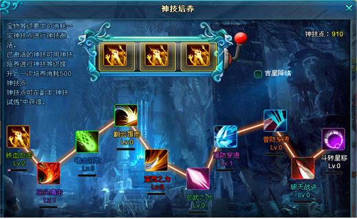 神技升级:神技被激活后可进行神技培养,每次培养需消耗一定的神技点,神技等级越高对角色加成的效果越显著。