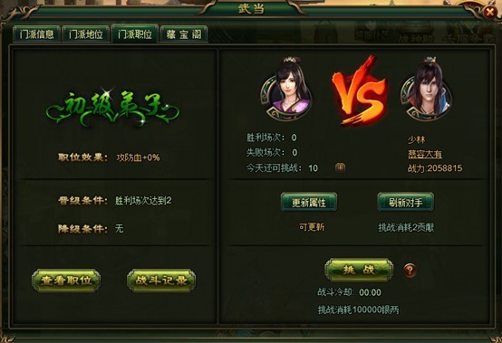 u 按照门派职位高低,职位越高挑战需消耗的银两越少,同时获得的威望越高;