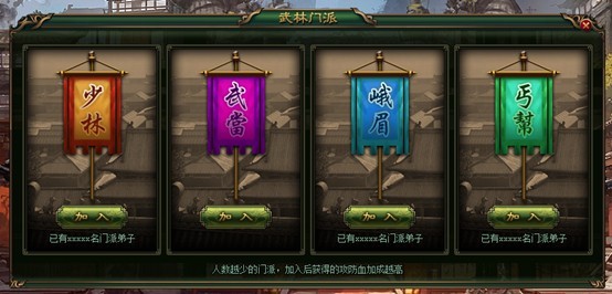 a) 总共分少林、峨眉、武当、丐帮四大门派,玩家仅可选择一个门派加入;