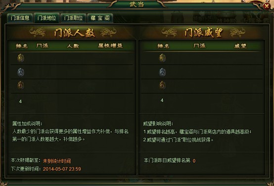 u 每日23:59统计一次门派威望值排名,排名越高决定次日藏宝阁与门派商店的道具越高级;统计完毕后清空威望值;