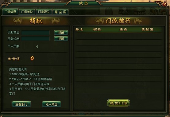 u 获取途径:通过捐献银两或者黄金可获得门派贡献值;100000银两=1贡献;1黄金=1贡献;