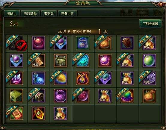 1、 玩家需前往“登陆礼”界面点击签到格进行签到,签到完毕后,当日的签到奖励将放至您的包裹中;