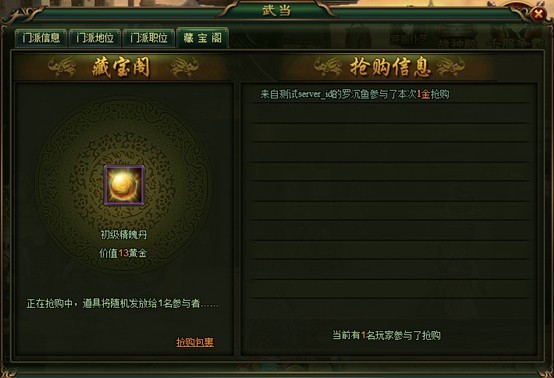 b) 藏宝阁每次会提供1个抢购道具,根据道具的价值不同,提供与价值数量相同的抢购名额(玩家可通过花费1黄金购买1个抢购资格),系统会随机将抢购道具分配给其中1名玩家,抢购到的玩家可前往抢购包裹界面领取道具;