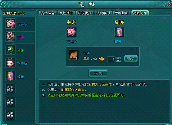 1、化形需要1个主宠和1个副宠,等级不限,每次化形消耗1个拓本;
