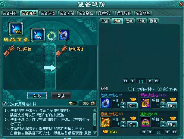 有了洗炼石就可以进行洗炼了,洗炼装备需要花费铜币,装备品质越高,洗炼一次花费的铜钱就越多。每件装备可同时拥有多种属性,要根据自己的职业来选择适合自己的属性。属性越多,星级越高越好。洗炼出新的属性可以代替旧的属性。