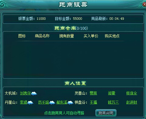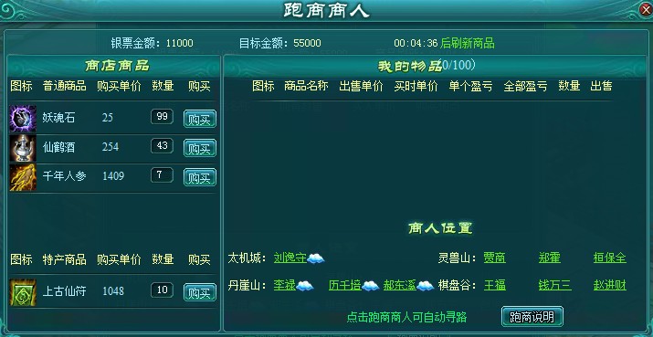 接取任务之后,就可以出仙盟领地开始跑商了。跑商共有4个NPC,其中一个在太机城,另外三个在野外。在这里要注意的是,在太机城的商人处买了商品必须要到野外的商人处贩卖才能获得利润。同样,如果在野外的商人处(不管是哪一个)买了商品,就必须要回到太机城来贩卖才会有利润,不然是会亏本的。