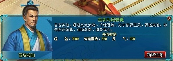 百炼成仙任务很简单,大多数是打怪任务,一般以10个怪为主,另外就是传递消息,谈话类的任务,就更加简单了。如果是VIP可以使用免费传送的话,基本可以瞬间完成。