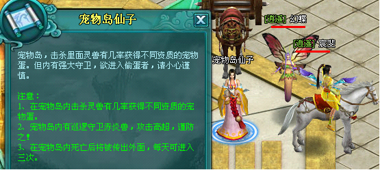 除此之外,30级之后我们可以在太机城的宠物岛仙子处进入宠物岛副本自己捕获宠物蛋,每人每天都有三次机会进入,遍地各种各样的宠物宝宝考验你的运气,不过在面对巡逻守卫的时候大家可要好好的练习一下捉迷藏的功夫;