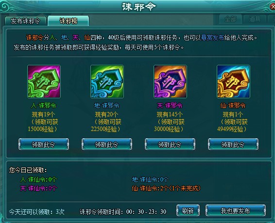 不论是发布诛邪令或者是领取诛邪任务,每次都只能发布或者领取一个任务,只有当所发布的任务被别人领取和自己所领取的任务完成之后,才能继续发布和领取下一个任务。