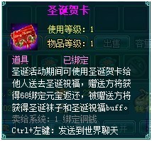圣诞活动期间,为了向那些曾经帮助过我们的人送去最真挚的圣诞祝福,商城-热卖栏将出现圣诞贺卡,在使用圣诞贺卡为他人送去祝福的同时,将获得68绑定元宝的返还。同时,得到你祝福的人还有得到一个圣诞袜子和圣诞祝福buff。