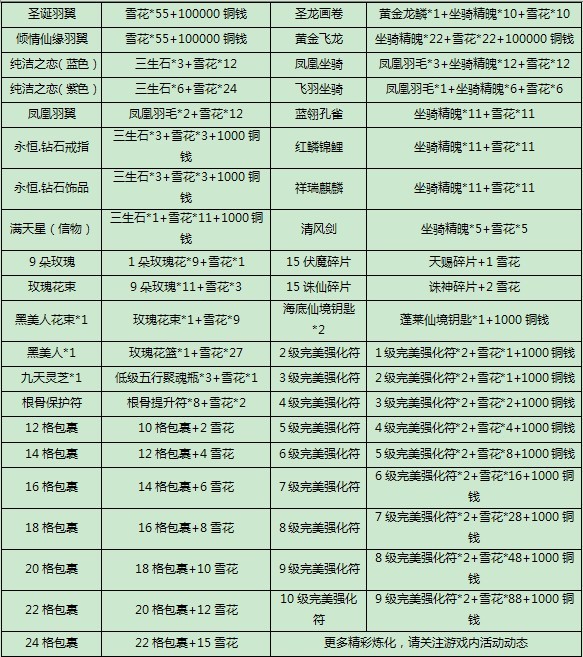 在活动期间,圣诞树中将有雪花掉落,只要凑齐足够的雪花,就能去太机城—圣诞老人处兑换丰富的道具:宠物天赋技能残片、圣诞布丁、各职业武器时装,黄金龙鳞、赤炎精魄、凤凰羽毛、驯鹿宠物等。