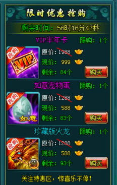 累计充值达到不同的额度,每个阶段还有高达50%的返利的充值大礼包倾情相送!不仅包含各种珍贵实用的道具,紫色装备、超炫羽翼、华丽时装、拉风坐骑、实用神宠更是应有尽有!
