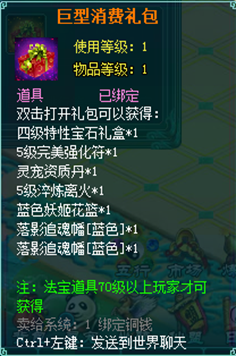 1、活动期间,玩家充值任意元宝即可获得双节活动充值礼包,内含:冰魄紫金瓶*1、根骨保护符*1、中级灵宠祝福果*1、海底珍宝钥匙*1、根骨提升符*2、宠物资质丹*1。(注:法宝道具70级以上玩家才可获得)