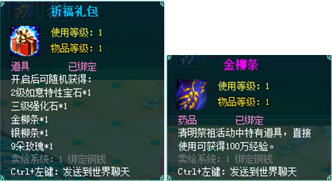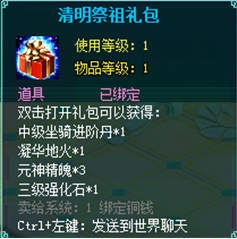 1、活动期间内,凡是等级大于等于35及的玩家均可获得【清明祭祖礼包】一个,每天只能获得一个哦!清明祭祖礼包内含青团,青团可直接使用随机获得:22222经验、22222绑定铜钱、22222灵气、2个2及强化石,2个2级如意宝石。