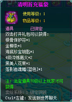 | 充值满任意元宝 | 清明充值福袋 | 活动时间,只能领取一次 |