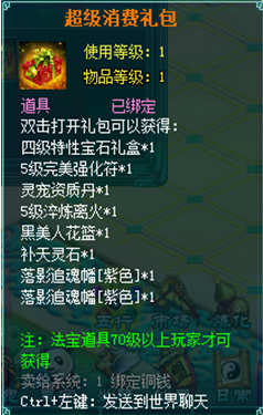 | 消费满9555元宝 | 超级消费礼包 | 活动时间,只能领取一次 |