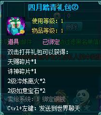 2、在摇动梧桐树的过程中,幸运者将有机会直接获得赤炎翎羽、5级如意宝石、银杏果小包、根骨保护符等极品道具。