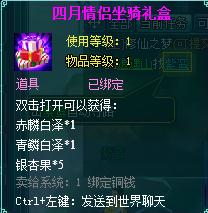 1、四月情侣坐骑礼包、四月宠物礼盒每人只能抢购一个,高级五行聚魂瓶每人能抢购5个。