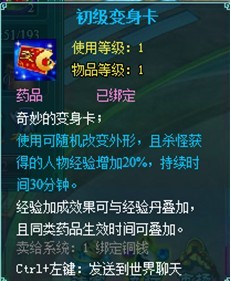 初级变身卡一张 35级以上玩家,使用可变身儿童,打怪经验20%加成