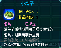 小粽子可用来喂养诱引鱼怪,当鱼怪之后,将在太机城随机刷出boss,击杀boss将获得丰厚的奖励。