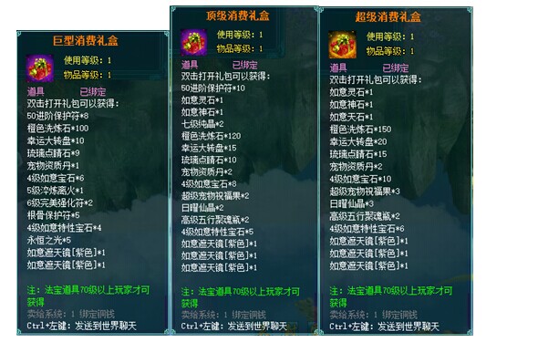 1、消费礼盒中的法宝道具等级70级以上玩家才可获得。
