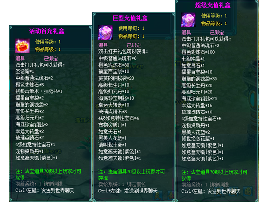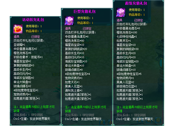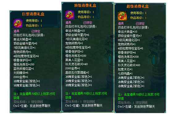2、充值礼盒中的法宝道具均为70级以上玩家才能获得。