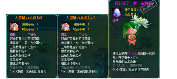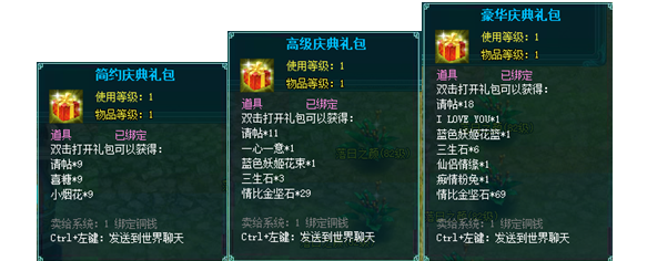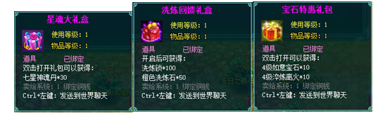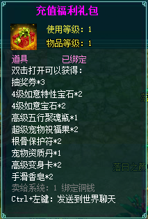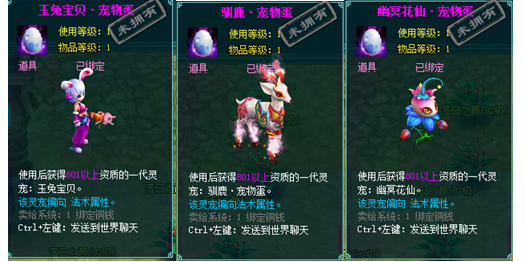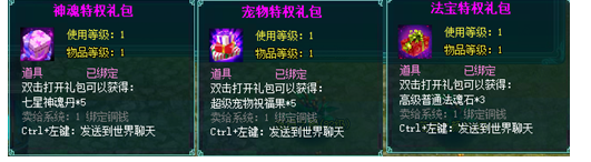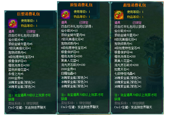 1、以上礼包中的物品除了宠物蛋外,其他全为绑定不可交易。