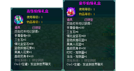 2、成功预订高级和豪华庆典后结缘双方将分别获得:高级仙缘礼盒、豪华仙缘礼盒。