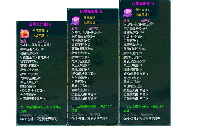 2、充值礼包中的法宝道具均为70级以上玩家才能获得。