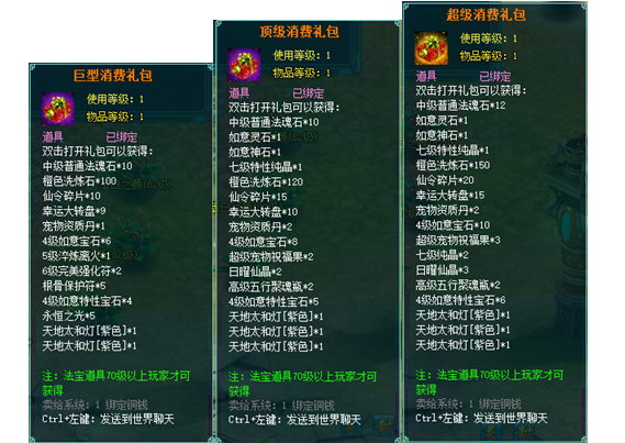 1、消费礼包中的法宝道具等级70级以上玩家才可获得。
