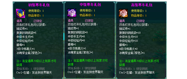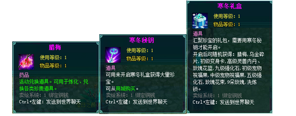 寒冬礼盒:可从副本、活动期间出现的boss掉落,需寒冬秘钥才能开启。