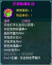 2、灵宠仙魂礼包:开启后获得:中级宠物祝福果*1、高级灵兽内丹*1、灵宠成长石*3、灵宠灵性丹*3、紫色炼魂晶*3、200珍宠币*1