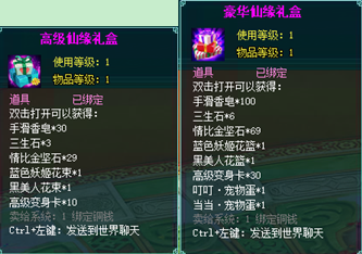 2、成功预订高级和豪华庆典后结缘双方将分别获得:高级仙缘礼盒、豪华仙缘礼盒。