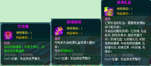 浪漫礼盒:可从副本、活动期间出现的boss掉落,需浪漫秘钥才能开启。