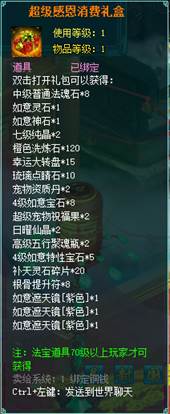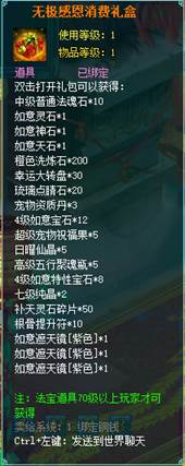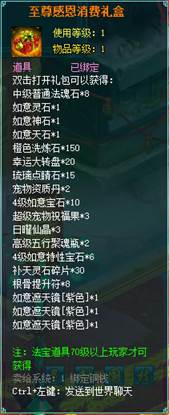 1、消费礼盒中的法宝道具等级70级以上玩家才可获得。