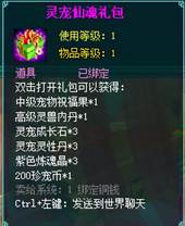 2、灵宠仙魂礼包:开启后获得:中级宠物祝福果*1、高级灵兽内丹*1、灵宠成长石*3、灵宠灵性丹*3、紫色炼魂晶*3、200珍宠币*1