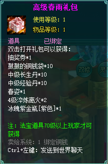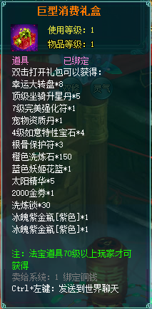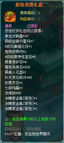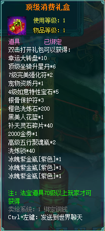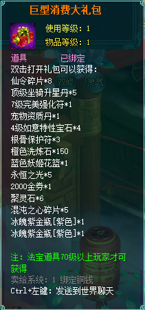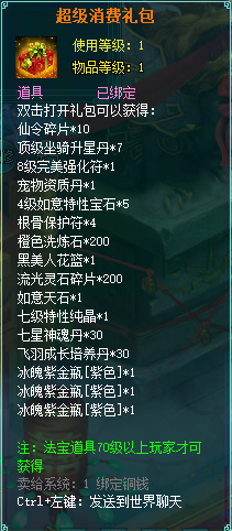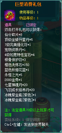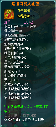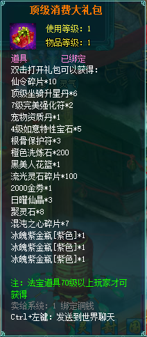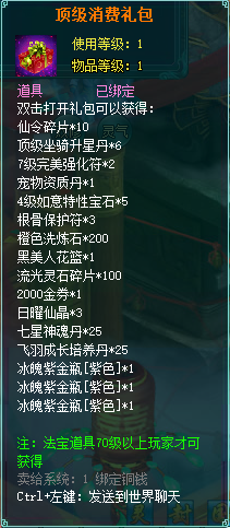 1、消费礼包中的法宝道具等级70级以上玩家才可获得。