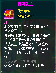春雨礼盒:可从副本、活动期间出现的boss掉落,需春雨秘钥才能开启。