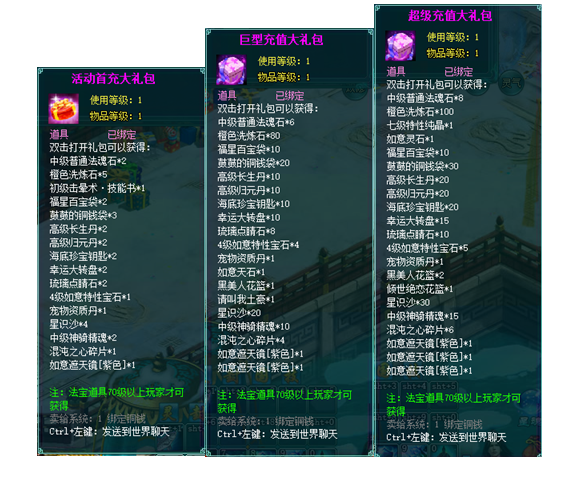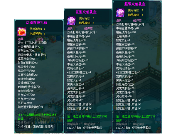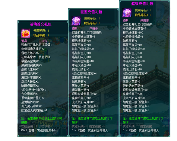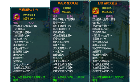 2、充值礼包中的法宝道具均为70级以上玩家才能获得。