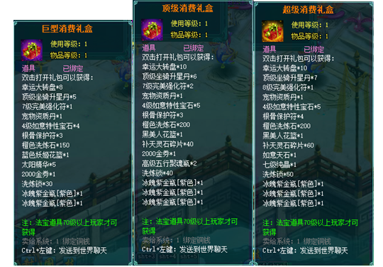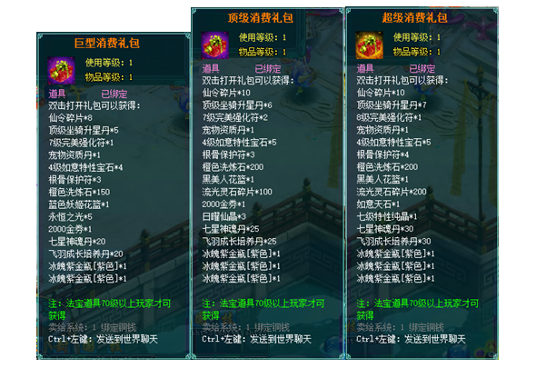 1、消费礼包中的法宝道具等级70级以上玩家才可获得。