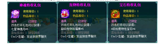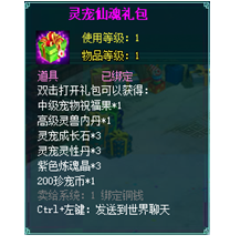 2、灵宠仙魂礼包:开启后获得:中级宠物祝福果*1、高级灵兽内丹*1、灵宠成长石*3、灵宠灵性丹*3、紫色炼魂晶*3、200珍宠币*1