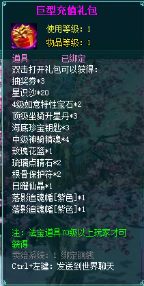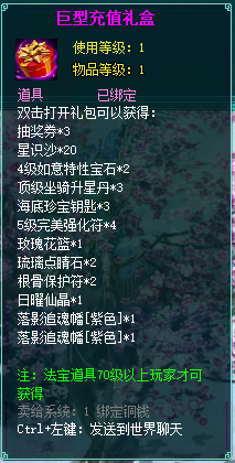 2、充值礼盒中的法宝道具均为70级以上玩家才能获得。