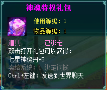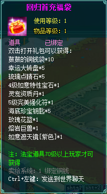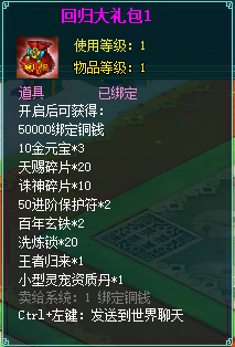 回归大礼包3:铜钱*50000、绑定元宝*30、天佑碎片*5、灵石碎片*20、60进阶保护符*2、千年玄铁*2、洗炼锁*20、中级五行聚魂瓶*1、远古残魂*5、小型灵宠资质丹*1。